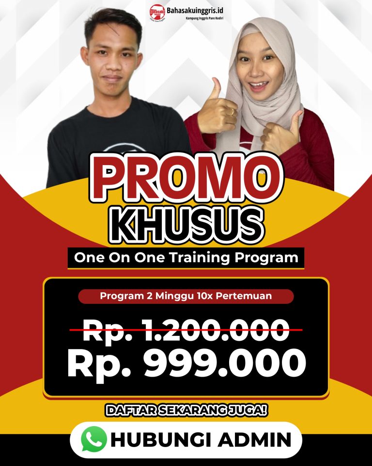 One-on-one Training adalah program TRAINING KHUSUS dimana peserta akan secara langsung mendapatkan TRAINING oleh mentor khusus KAMPUNG INGGRIS PARE secara one-on-one (satu peserta satu mentor khusus). Didesign KHUSUS secara APLIKASI menggunakan FIT METHOD yang disesuaikan dengan LEARNING TARGET setiap peserta.